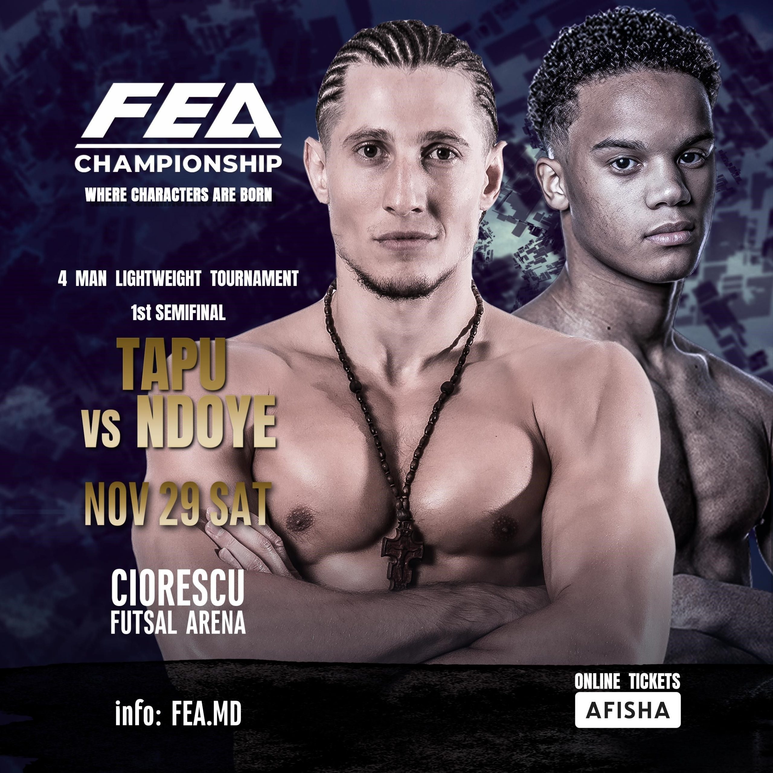 Pe 29 noiembrie, în cadrul turneului FEA CHAMPIONSHIP, va avea loc Grand Prix-ul, iar în prima semifinală se vor înfrunta Denis Țapu și Isakh Ndoye. Denis Țapu este deja bine cunoscut pentru măiestria sa nu doar în Republica Moldova, ci și la nivel internațional, fiind considerat unul dintre cei mai buni luptători din categoria ușoară. Scopul său în acest Grand Prix este să câștige competiția și să obțină din nou dreptul de a lupta pentru centura de campion, deținută în prezent de Victor Apostol.