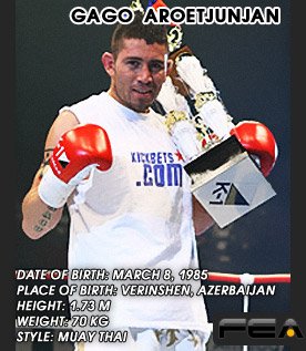 Gago «Drago» Harutyunyan (born on 8 March 1985) – kikbokser from Armenia, now the speaker for the Club Gym Alkmaar, Netherlands. Known for his shock combinations and unpredictable strikes legs. Gago is currently taking part in the championship K1 MAX, real-under the leadership of Edwin Van Osa.